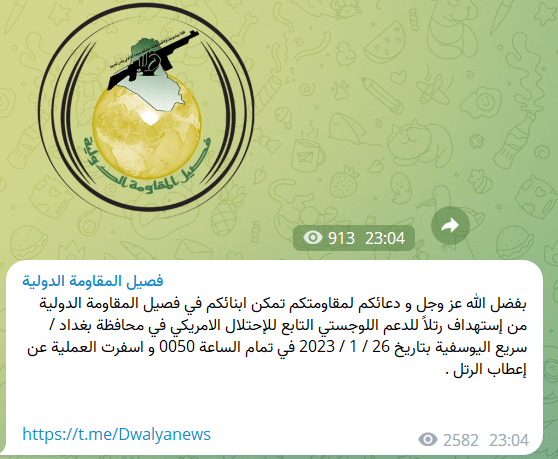 “Thanks to Allah Almighty and to your prayers for your resistance, your children in the international resistance faction were able to target the logistical support for the American occupation in Baghdad province / Saree Al-Yousafia on 01/26/2023 at 0050 hours and the convoy was delayed due to the damage of the attack.“