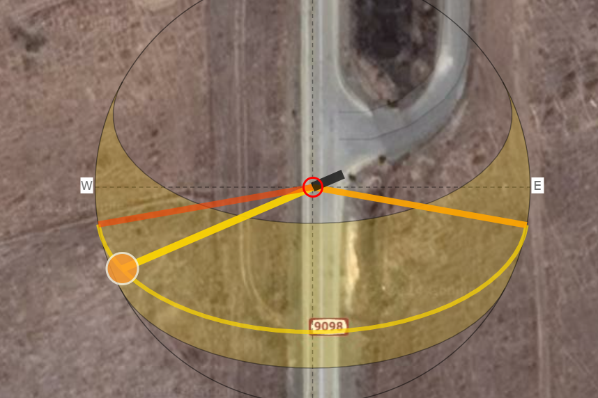 With this, it can be confirmed that the video was taken by the Israelis travelling on road 9098 at approximately 4pm. The time of the incident can be attested using the approximate length and angle of the shadow cast by the bus in the video. If we assume that the bus is 2.5m tall and driving on the right side of the road, then the shadow would reach the point in the road where the tarmac bends eastwards on the opposite side of the road.