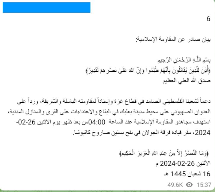 In support of our steadfast Palestinian people in Gaza, and in solidarity with their brave and honourable resistance, and in response to the Zionist aggression on the surroundings of the city of Baalbek in the Bekaa and the attacks on villages and civilian homes, the mujahideen of the Islamic resistance targeted, at 4:00 PM on Monday, 26-02-2024, the headquarters of the Golani Brigade in Nafah with sixty Katyusha rockets.