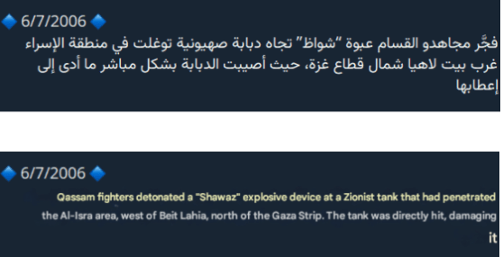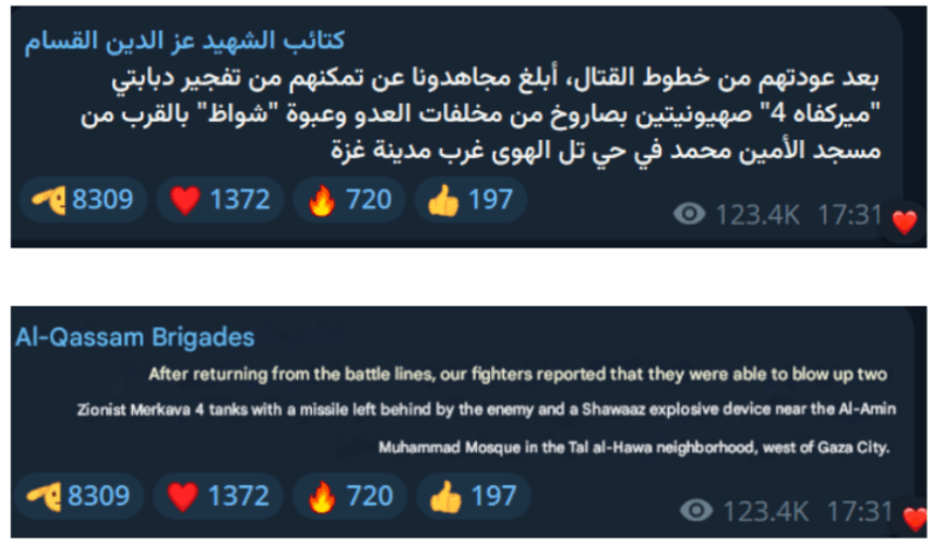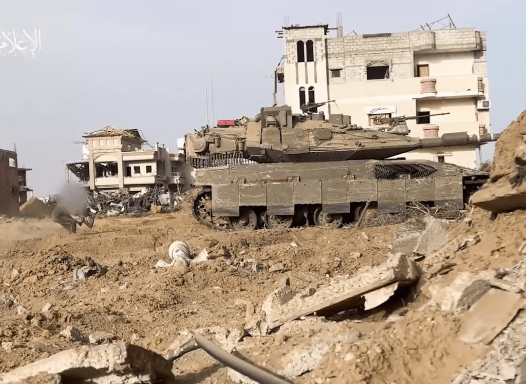 Footage published by Kata’ib al-Qassam also shows Shuath devices being used alongside other anti-armour weaponry, notably the Yassin 105 Tandem-warhead shoulder-fired projectile — a tandem warhead designed and intended to bypass the reactive armour of Israeli Merkava tanks.